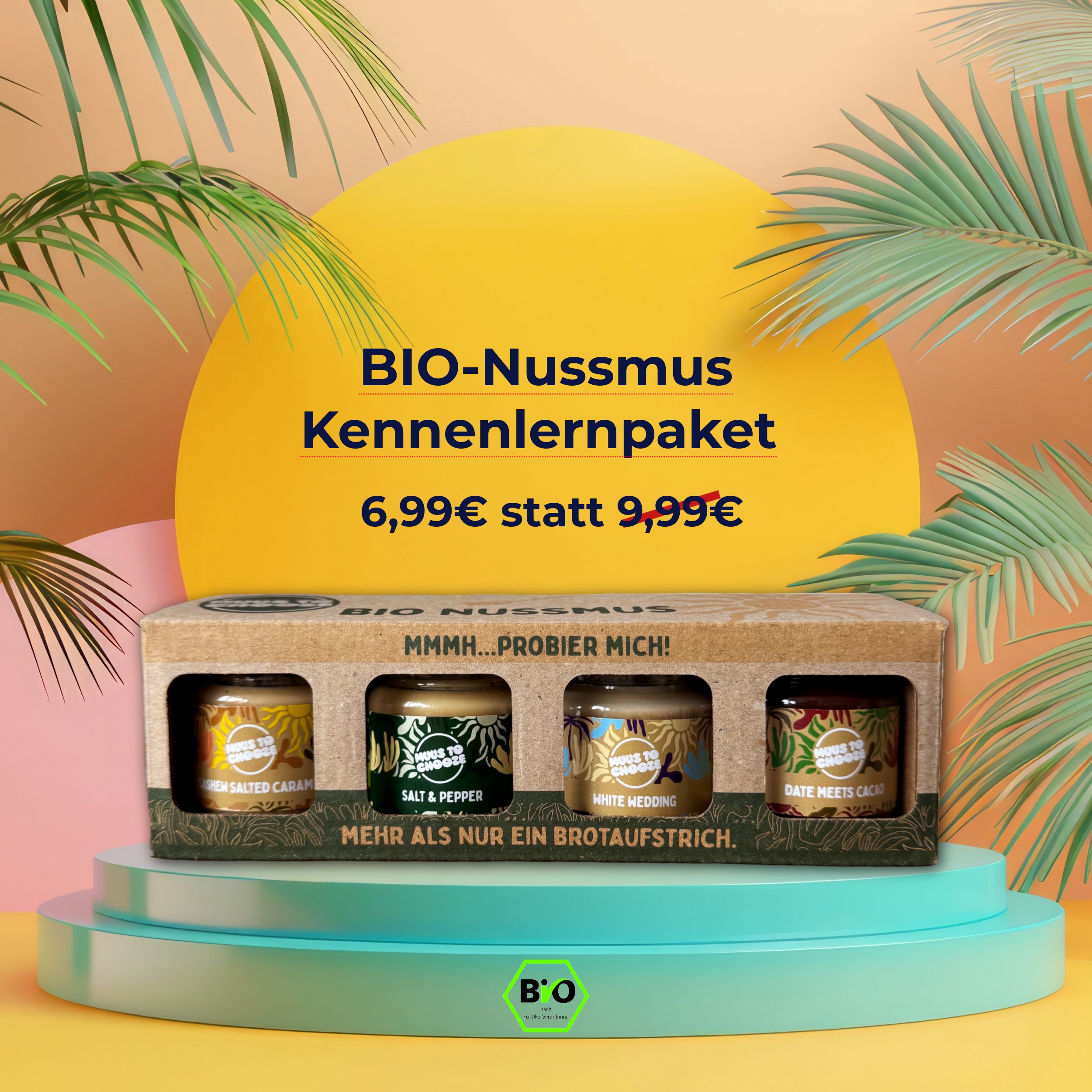 Bio MUUS TO CHOOZE Crunchy DreamUnser Traum vom Jahrmarkt: Mandelmus Crunchy DreamWelchen Duft erinnerst du vom Jahrmarkt deiner Kindheit? Gebrannte Mandeln, stimmt's? Und genau diesen Duft haben wir in ein Glas zum Aufschrauben gepackt. Du öffnest den Deckel und sofort umweht dich der Karamellduft von gerösteten Mandeln, Zimt und Zucker. Wir haben aber den gewöhnlichen Zucker gegen Kokosblütenzucker ausgetauscht, damit du mit noch mehr Karamellduft verzaubert wirst.Lieber Brotaufstrich oder einfach nur Wegnaschen?Willkommen in einer Welt voller Genuss und gesunder Köstlichkeiten! Bio MUUS TO CHOOZE ist die Marke mit den außergewöhnlichen Kreationen für Nussmus und Brotaufstrich. Mit unserem Mandelmus Crunchy Dream möchten wir dich vom Frühstück bis zum Abendbrot verwöhnen. Denn du kannst das Bio-Mandelmus auf dein Frühstücksbrot streichen, mittags zum Kochen verwenden und abends dein Essen damit verfeinern. Desserts lieben das Bio-Mandelmus ebenso wie Saucen. Hier ein paar Ideen für dich und dein Mandelmus Crunchy Dream:Auf dein MorgencroissantAls Topping auf EiscremeZu Pfannkuchen oder CrêpesIn das PorridgeRaffiniert in SalatsaucenBeim Reiter "Verwendung" findest du tolle Rezepte für dein neues Lieblings-Mandelmus Bio MUUS TO CHOOZE Crunchy Dream.Crunchy Dream ist mehr als ein einfaches MandelmusDieses besondere Mandelmus ist eine kulinarische Offenbarung. Die Basis bildet eine sorgfältig austarierte Mischung mit 75% gerösteten Mandelkernen und 24% kostbarem Kokosblütenzucker, ergänzt durch eine fein abgestimmte Prise Gewürze wie Zimt und Zitronenschale. All diese Zutaten stammen aus kontrolliert biologischem Anbau und sind vegan, was dieses Mandelmus zu einem perfekten Begleiter für eine bewusste und gesunde Ernährung macht. Von Natur aus enthält es auch kein Gluten.Mit unserem Bio MUUS TO CHOOZE Crunchy Dream kannst du so vieles verfeinern und deinen Gerichten und Speisen einen ganz neuen Geschmack geben. Deine Küche wird zum Gourmet-Tempel werden.Mandeln verwöhnen dich mit wertvollen NährstoffenDoch nicht nur der Geschmack macht das Mandelmus Crunchy Dream so besonders. Es ist auch ein wahres Nährstoffwunder. Mandeln sind reich an gesunden Fetten, Vitamin E und Antioxidantien, die deinem Körper gut tun. Der Kokosblütenzucker verleiht eine natürliche Süße und hat einen niedrigen glykämischen Index, was bedeutet, dass dein Blutzuckerspiegel nach dem Genuss stabil bleibt.Mmmmh so smoooooth – Bio-Mandelmus als Aufstrich, in Saucen oder DessertsDas Besondere am Mandelmus ist die superfeine und cremige Konsistenz. Wir nennen diese neue Textur smoooooth, denn das Mandelmus zerfließt im Mund und überall, wo du es als edle Zutat hinzufügst. Unser "Geheimnis" ist der aufwändige Zermuser, der aus Mandeln ein echtes Mandelmus macht. Keine Messer, die viel zu heiß werden, zerhacken die kostbaren Mandeln, sondern hohe Geschwindigkeit und die Zermusung lassen dieses einzigartige Mandelmus entstehen.Noch mehr mmmh smoooooth Nussmus findest du hier:Bio MUUS TO CHOOZE Salt & Pepper – smoooooth!Bio MUUS TO CHOOZE Bruschetta – smoooooth!Bio MUUS TO CHOOZE Salted Caramel – smoooooth!Bio MUUS TO CHOOZE White Wedding – smoooooth!