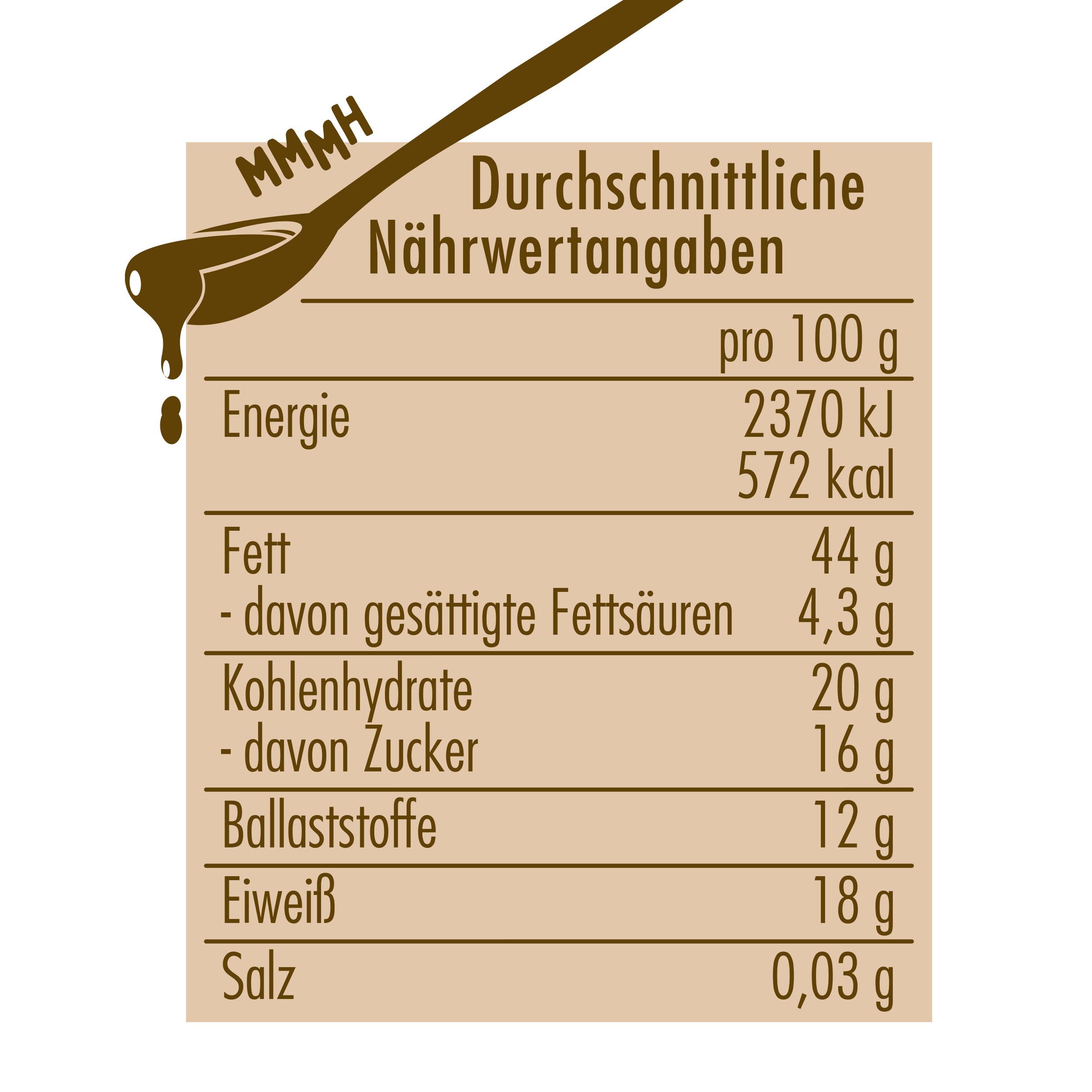 Das Besondere am Mandelmus ist die superfeine und cremige Konsistenz. Wir nennen diese neue Textur smoooooth, denn das Mandelmus zerfließt im Mund und überall, wo du es als edle Zutat hinzufügst. Unser "Geheimnis" ist der aufwändige Zermuser, der aus Mandeln ein echtes Mandelmus macht. Keine Messer, die viel zu heiß werden, zerhacken die kostbaren Mandeln, sondern hohe Geschwindigkeit und die Zermusung lassen dieses einzigartige Mandelmus entstehen.