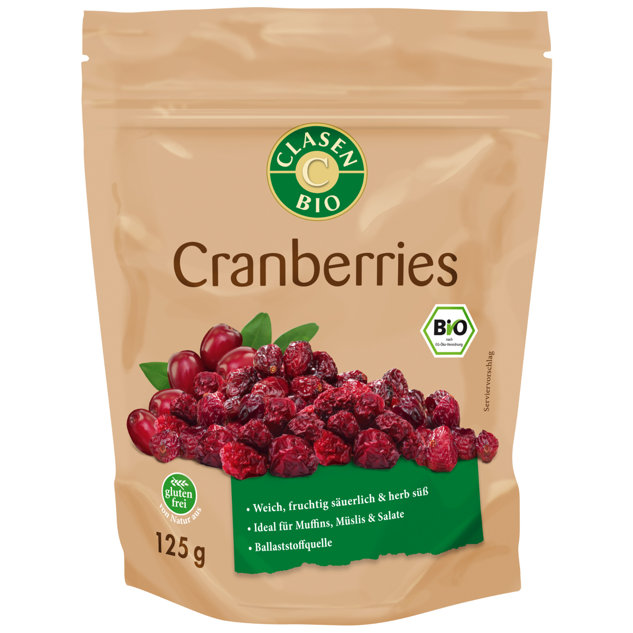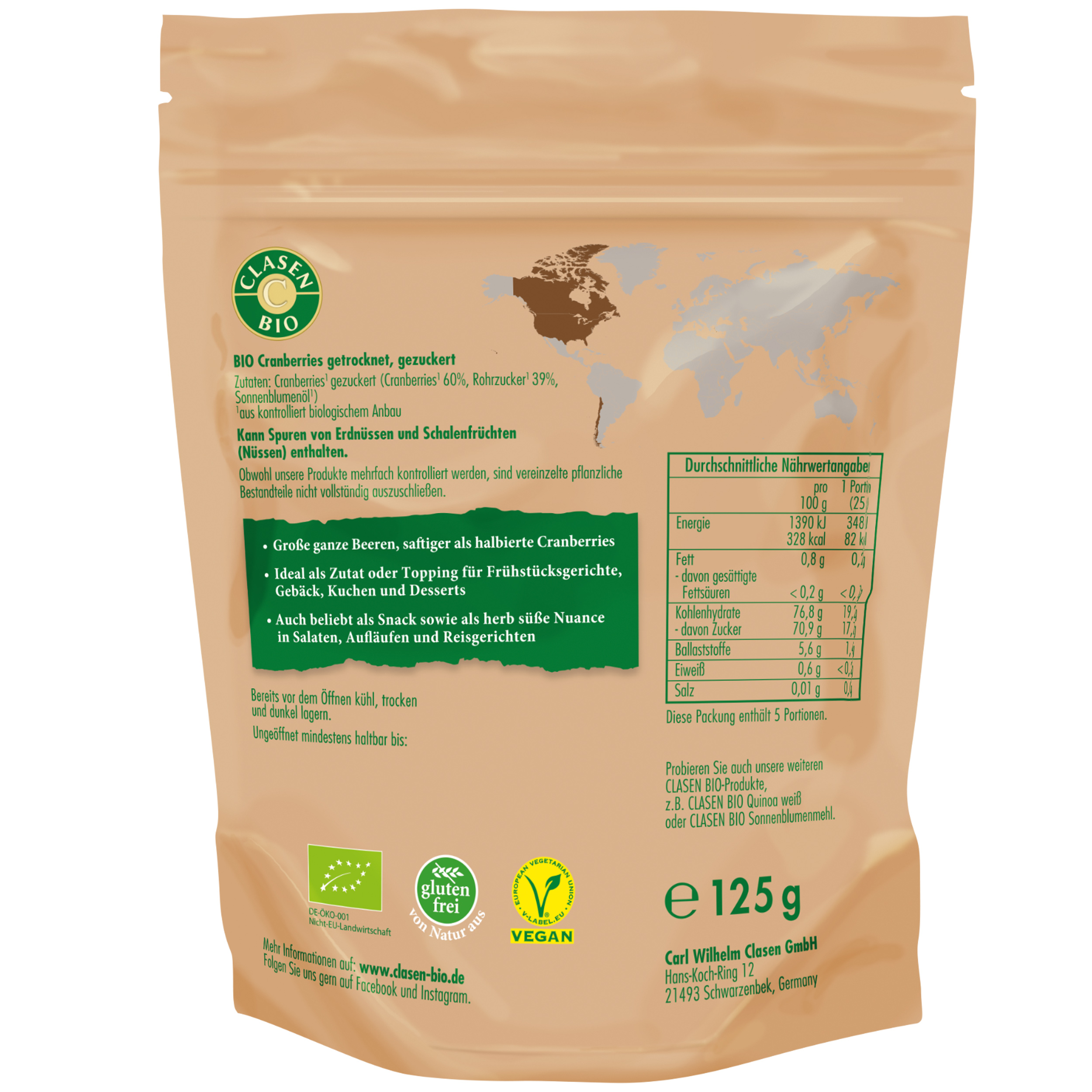 Für die Herstellung der CLASEN BIO Cranberries werden ausschließlich ganze Beeren verwendet, die mit Rohrzucker gesüßt werden. Die Verarbeitung ganzer Cranberries hat den großen Vorteil, dass ihr Saft innerhalb der Beeren erhalten bleibt, weshalb sie mit ihrem vollen Geschmack und weichen Biss auftrumpfen können.