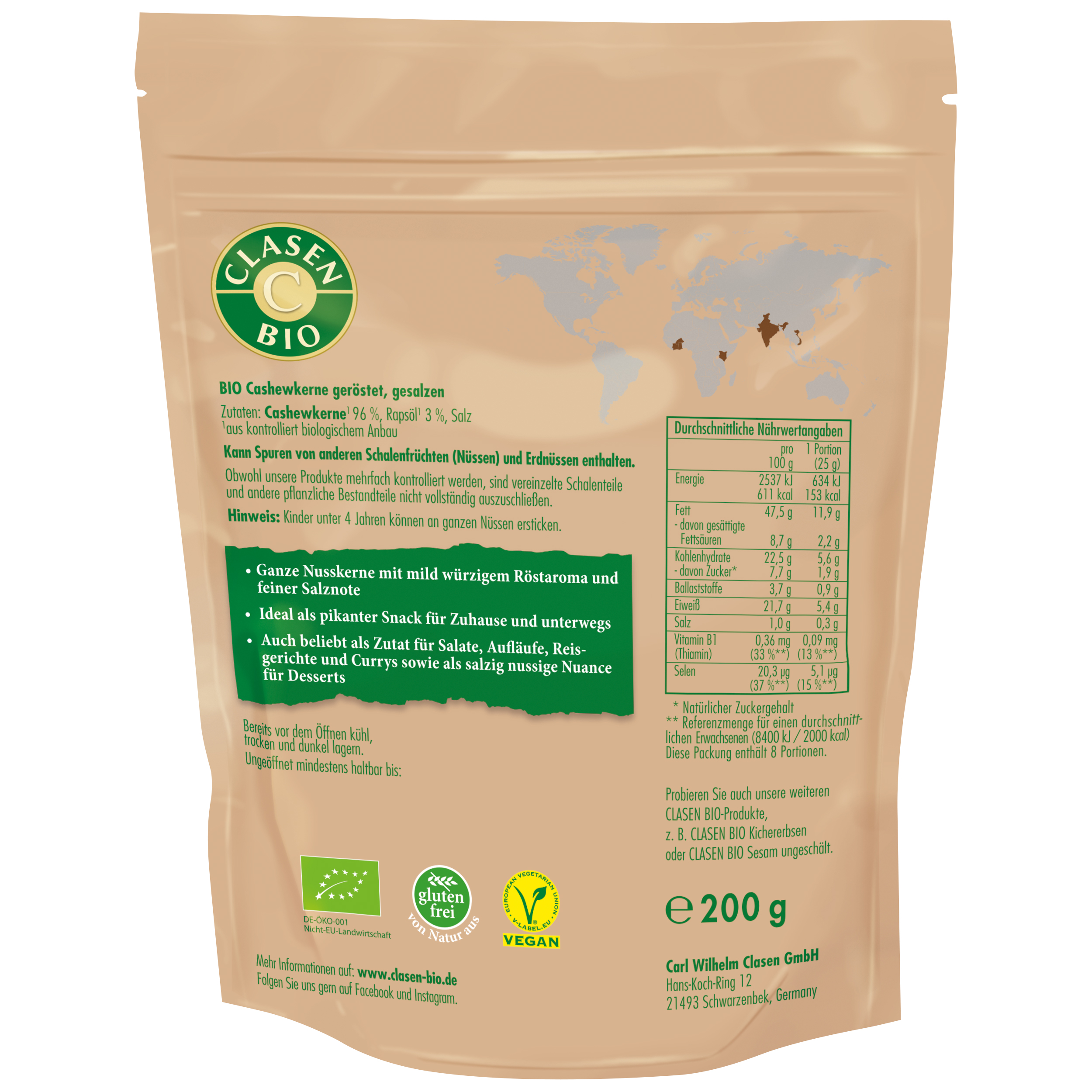 Unsere gerösteten und gesalzenen CLASEN BIO Cashewkerne sind von Natur aus vegan und glutenfrei.