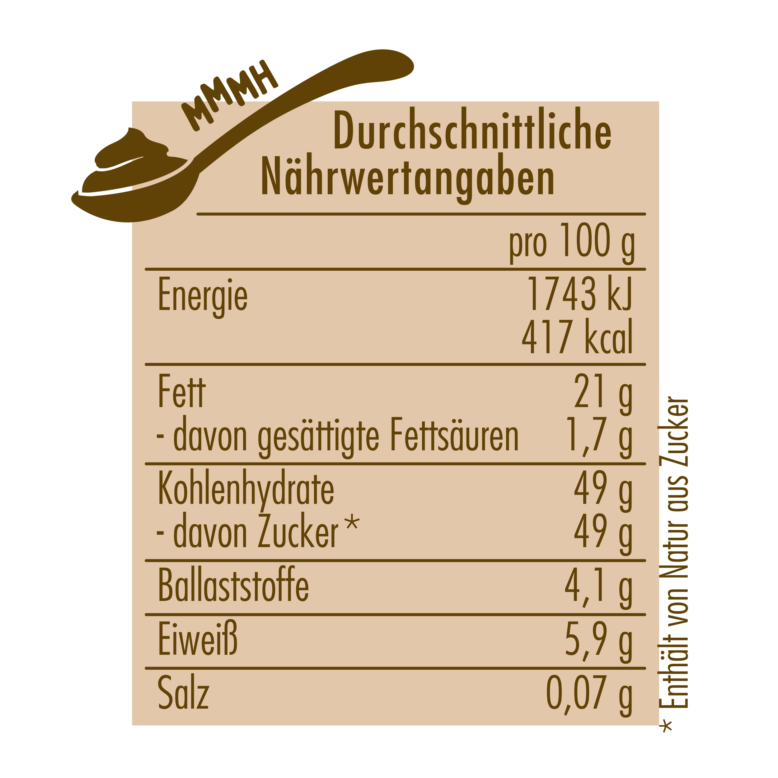 Übrigens: Während der Lagerung kann sich bei Wärme in unserer Creme nusseigenes Öl absetzen. Dies ist ein natürlicher Vorgang, der die Qualität nicht mindert. Durch Aufrühren der Creme wird die Konsistenz der Haselnusscreme wieder thick & sticky.
