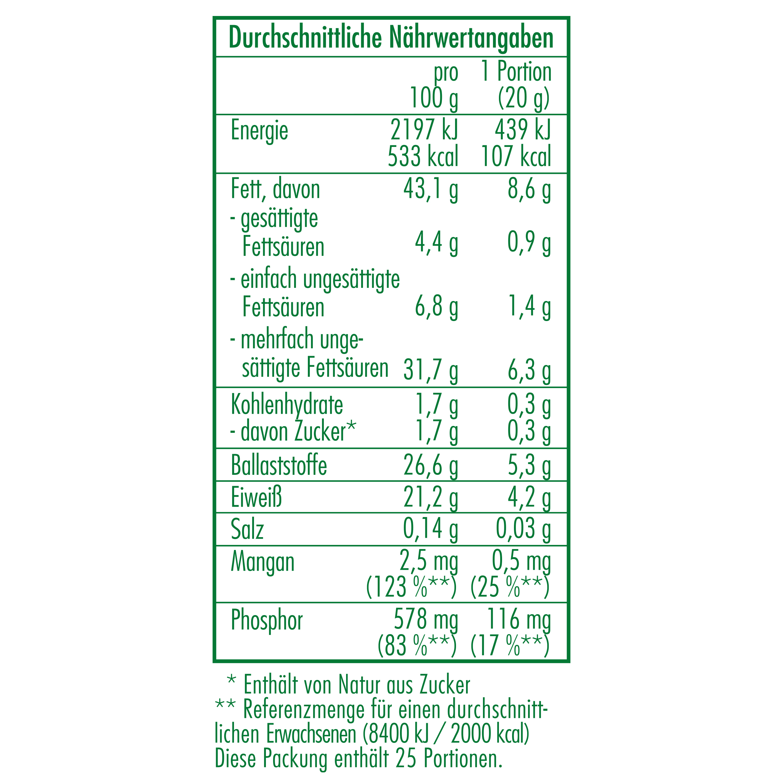 Inhaltlich können die Goldleinsamen mit reichlich Mangan, Phosphor sowie Ballaststoffen aufwarten und sie sind noch dazu eine Eiweißquelle. Sowohl das enthaltene Mangan als auch Phosphor tragen zu einem normalen Energiestoffwechsel und zum Erhalt gesunder Knochen bei. Mangan leistet außerdem einen Beitrag zum Schutz der Zellen vor oxidativem Stress.