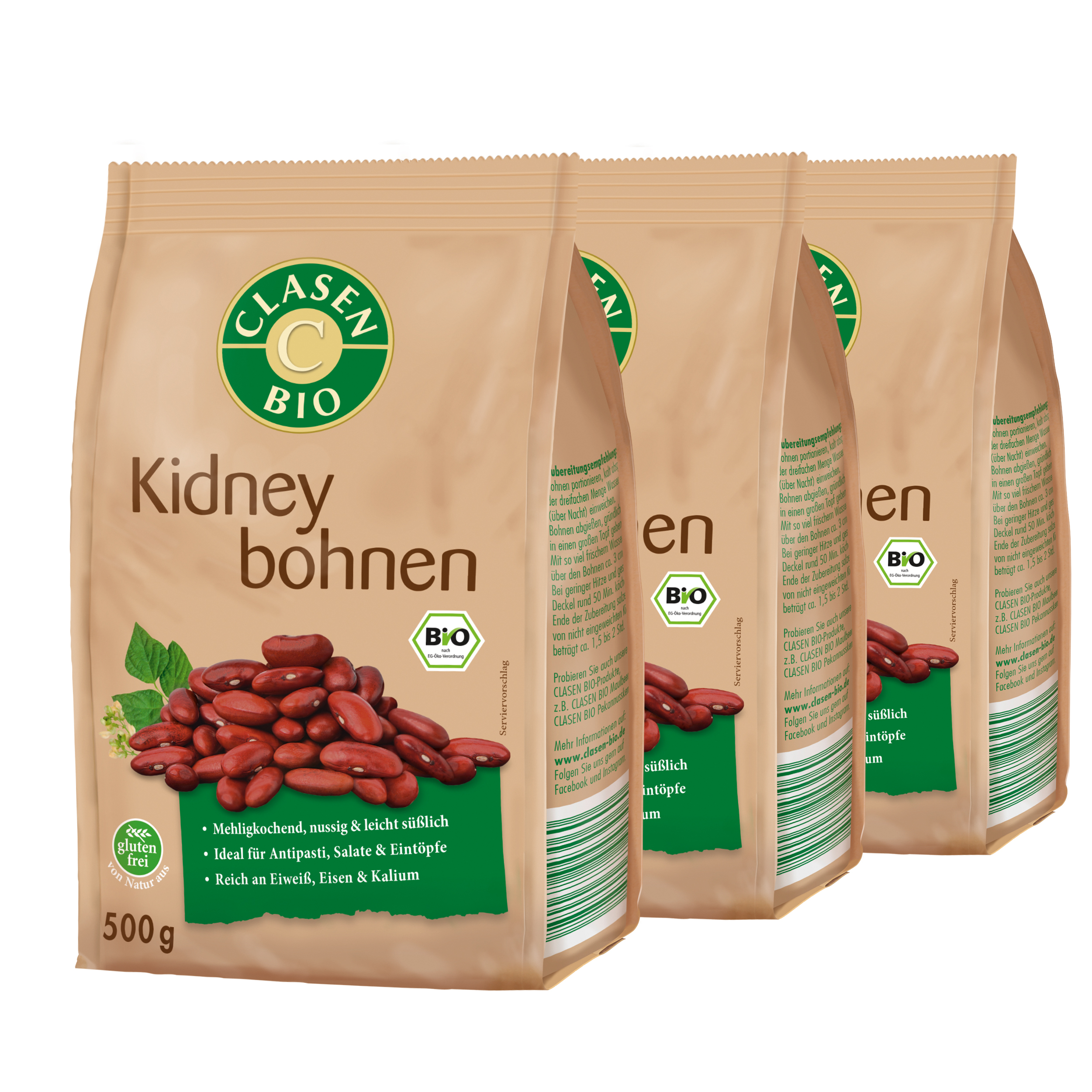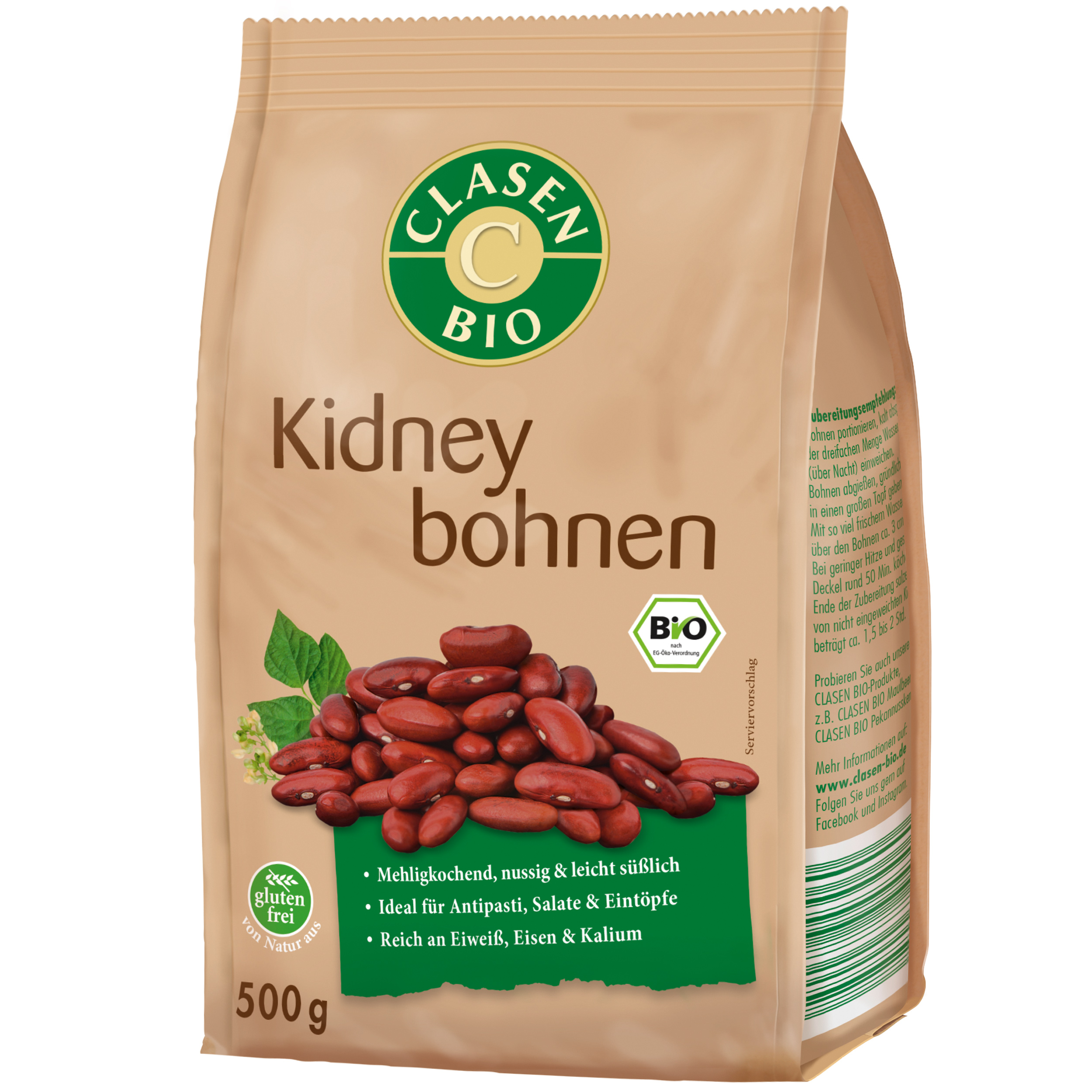 CLASEN BIO Kidneybohnen haben nach dem Kochen einen weichen Biss und passen mit ihrem sanft nussigen Geschmack zu vielerlei Speisen. Kidneybohnen enthalten ein Proteingemisch, das erfordert, dass die Bohnen nur gekocht verzehrt werden dürfen.