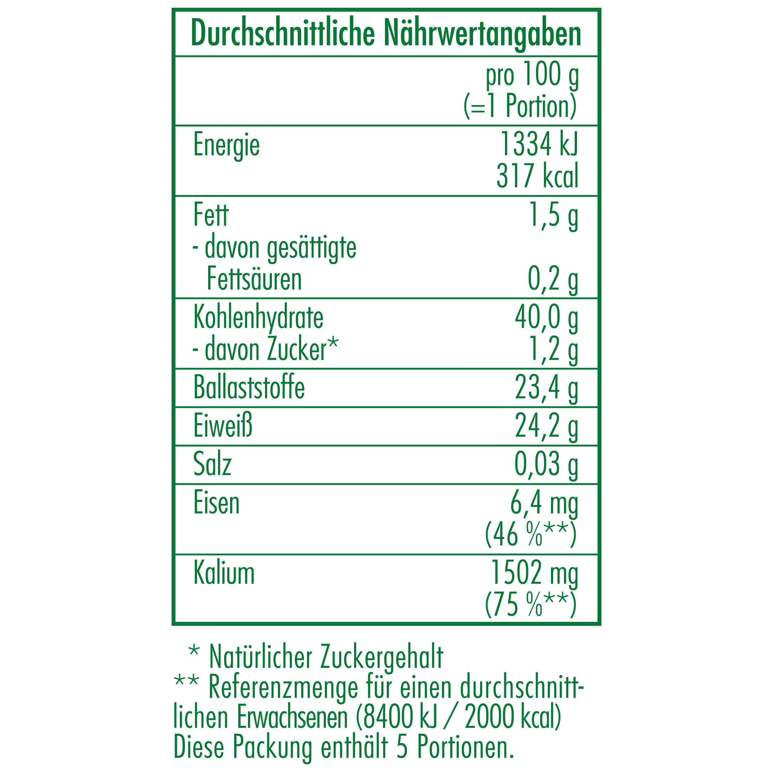 Um von den oben genannten positiven Wirkungen zu profitieren, verzehre 1 Portion (100 g) CLASEN BIO Kidneybohnen pro Tag.