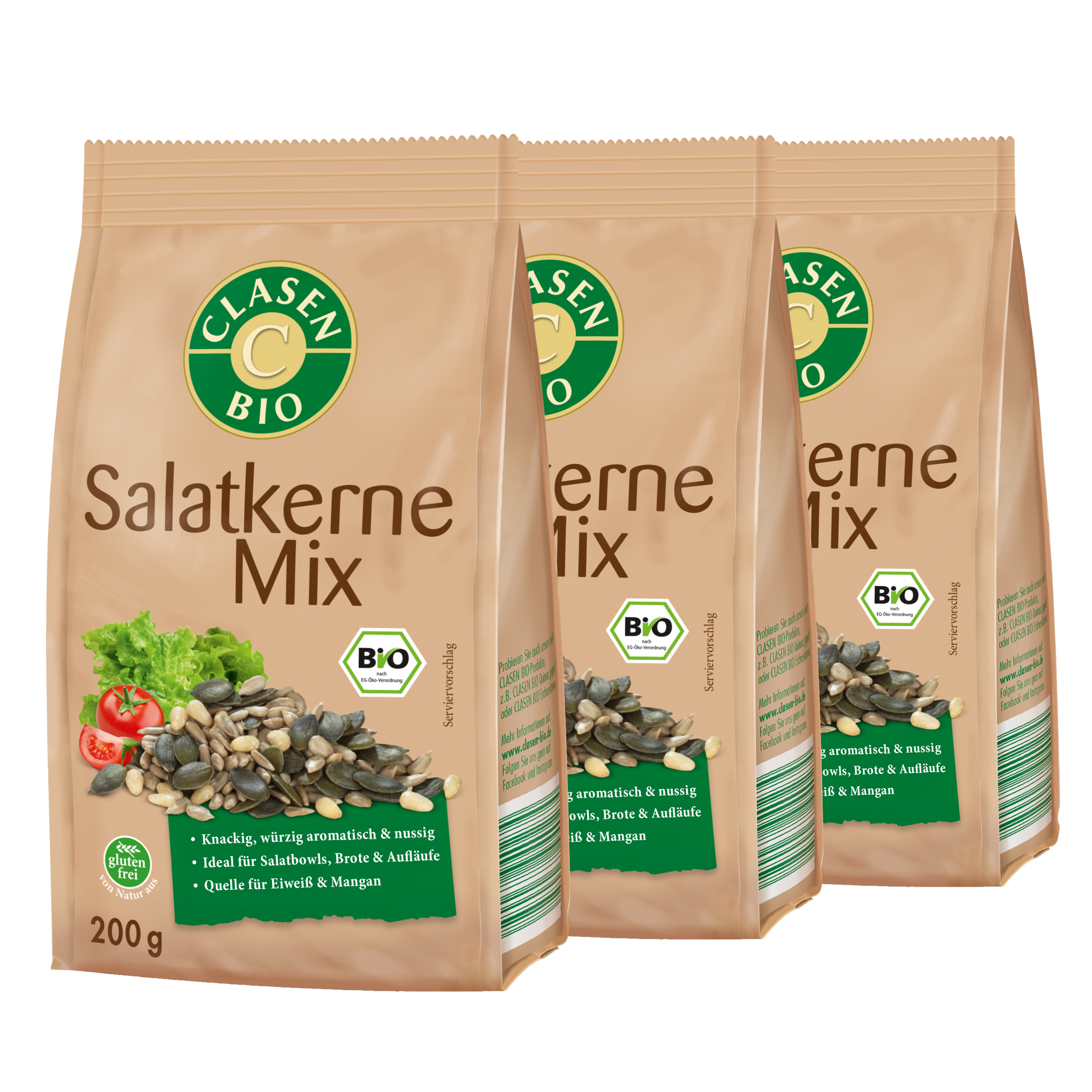 Passend zu seinem Produktnamen ist der Salatkerne-Mix von CLASEN BIO die ideale und schnelle Aufwertung für deine Salate. Die Kerne können praktisch zu jeder Art von Salat gegeben werden; vom bunten Blattsalat, über mediterrane (Nudel-)Salate bis zum fruchtigen Obstsalat. Röste den Mix dafür am besten ohne Fettzugabe in einer Pfanne an – so entfalten die Kerne noch besser ihr herrlich würziges und nussiges Aroma.