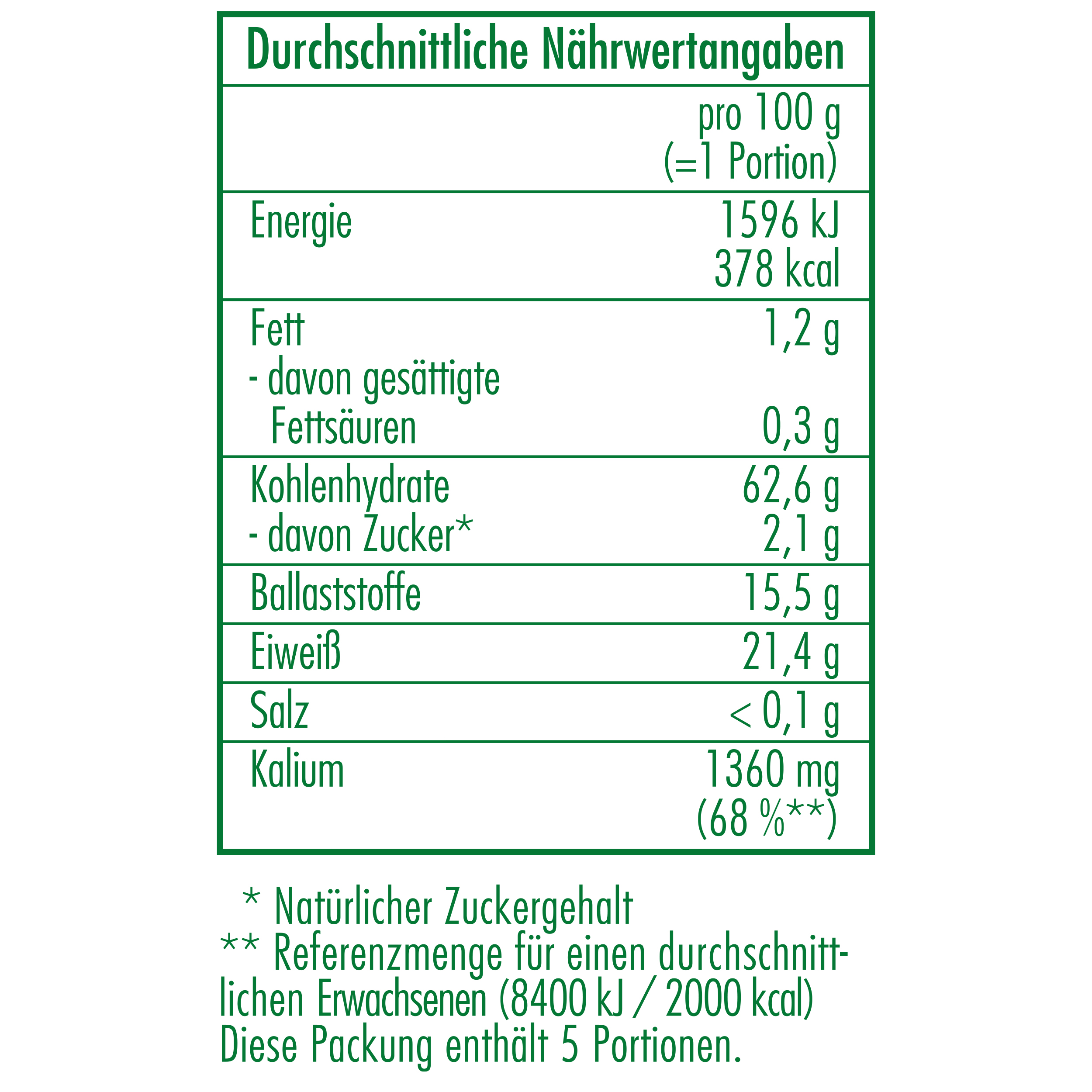 Klassischer Weise kommt mit Hülsenfrüchten immer eine Portion Eiweiß auf den Teller – auch die Wachtelbohnen sind eine natürliche pflanzliche Eiweißquelle. Daneben punkten sie mit reichlich Ballaststoffen und einem hohen Kalium-Gehalt. Der Mineralstoff Kalium trägt zum Erhalt eines normalen Blutdrucks und zudem zur gesunden Funktion des Nervensystems bei.