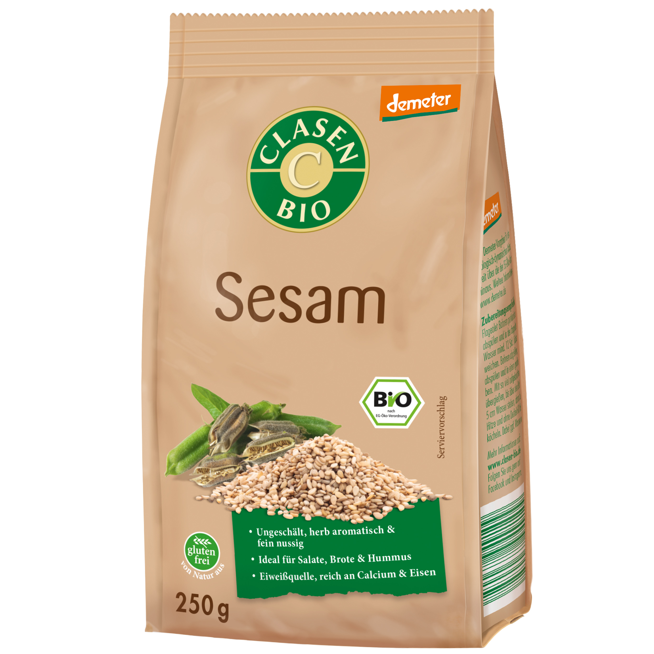 Sesam ist der Samen einer krautig wachsenden Pflanze, eine der ältesten Kulturpflanze, die ursprünglich aus Indien kam. Sie hat sich dann aber im ganzen asiatischen Raum schnell verbreitet. Sesamsamen schmecken herb aromatisch und bezitzen ein feines nussiges Aroma. Der Bio Sesam von CLASEN BIO ist ungeschält und findet in der asiatischen Küche Verwendung. Auch in der arabischen Küche ist Sesam ein fester Bestandteil.