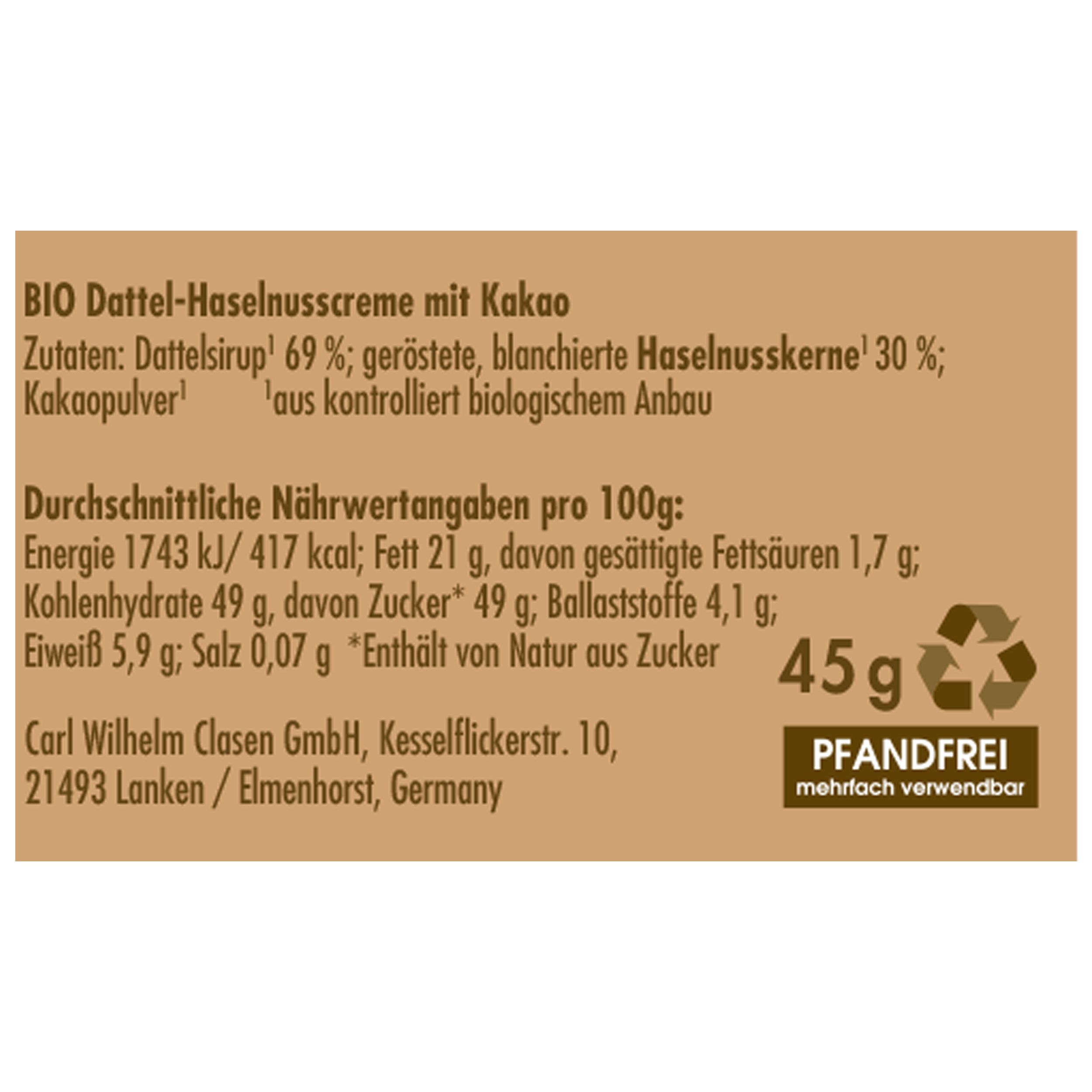 Der Anteil der Datteln ist höher als der der Haselnüsse. Deshalb kann man nun diskutieren, ob es sich um eine Dattelcreme, ein Dattelmus, eine Nuss Nougat Creme oder Nougatcreme handelt. Wir von CLASEN BIO sagen einfach "Date meets Cacao" dazu. Und genießen stillschweigend.