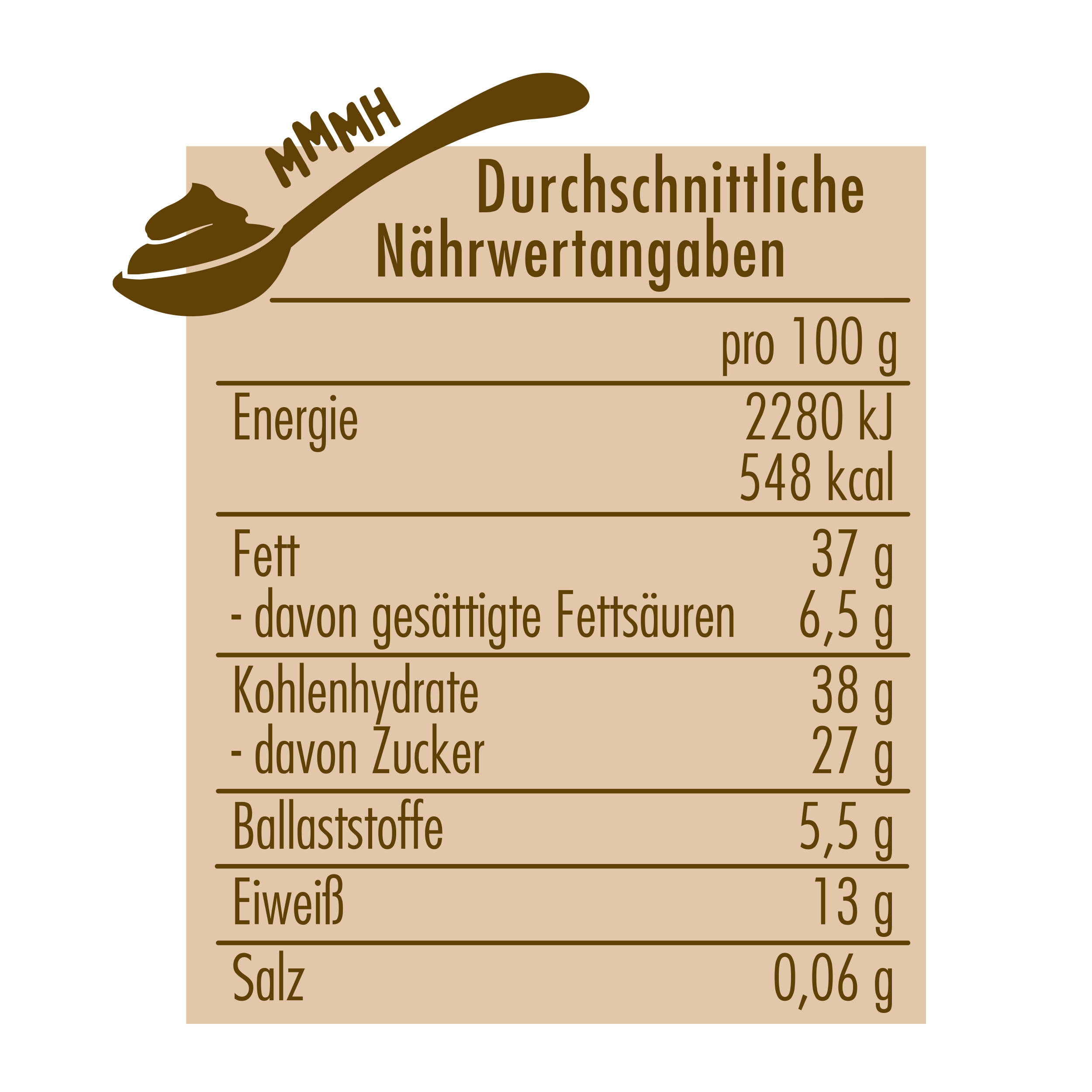 Nicht jede Kaffeebohnen eignet sich, um unserem Cashewmus seinen unverwechselbaren Geschmack zu verleihen. Wir verwenden ausschließlich Robusta-Kaffeebohnen – sie sind weicher und aromatischer als herkömmliche Arabica-Bohnen und fügen sich wunderbar in das cremige Profil unserer Cashews ein. Die Bohnen werden in einer kleinen Rösterei in Hamburg sorgfältig geröstet, genau so, wie es unsere Cashews lieben. Anschließend mahlen wir sie so fein, dass du nur noch das köstliche Aroma wahrnehmen wirst.