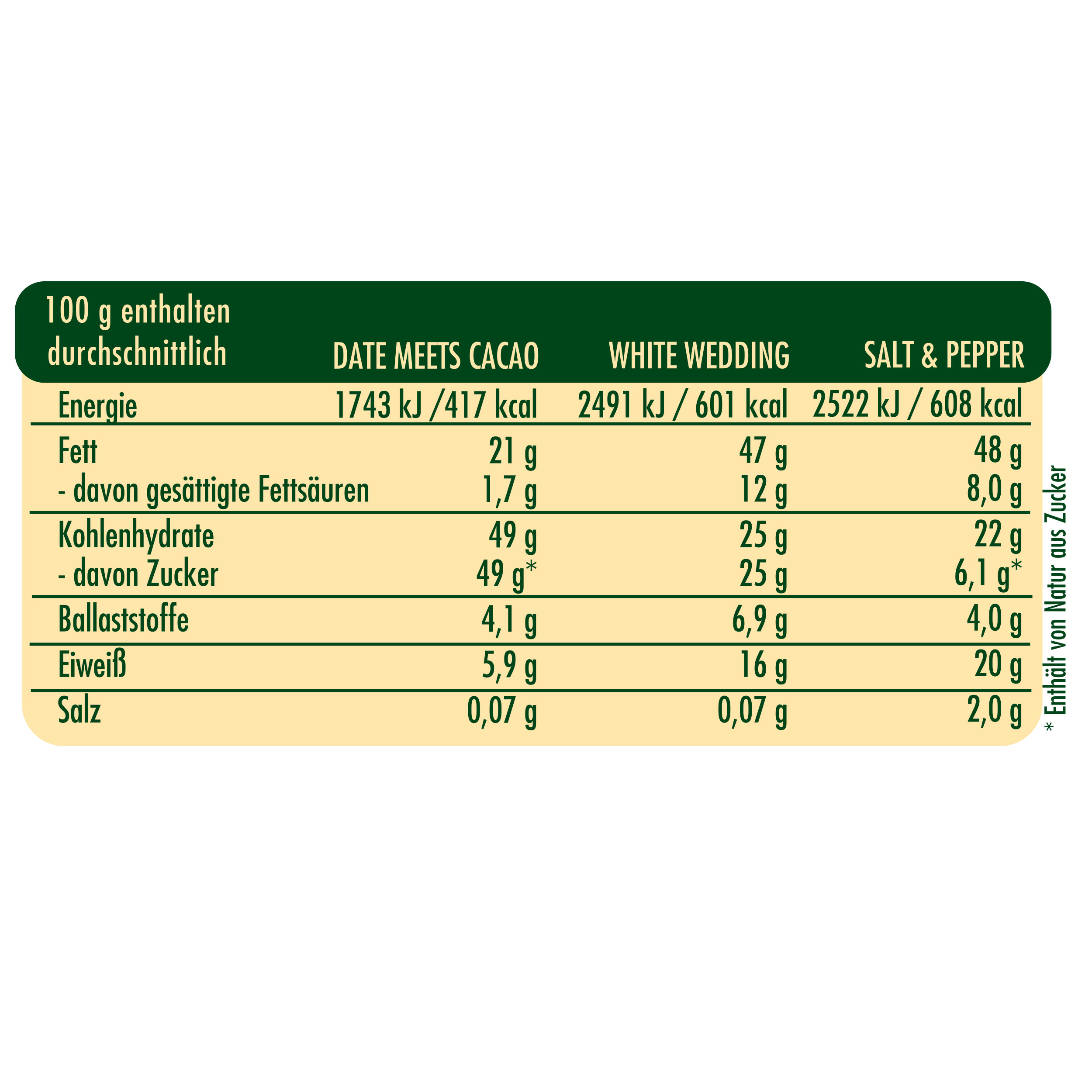 - Date meets cacao ist das Must-have für alle Schokoladenfans! Mit der natürlichen Süße der Dattel, Cashew und dem intensiven Aroma von Kakao eignet sich dieses Nussmus nicht nur als Aufstrich, sondern auch als Basis für selbstgemachte Pralinen oder zum Verfeinern von Porridge.