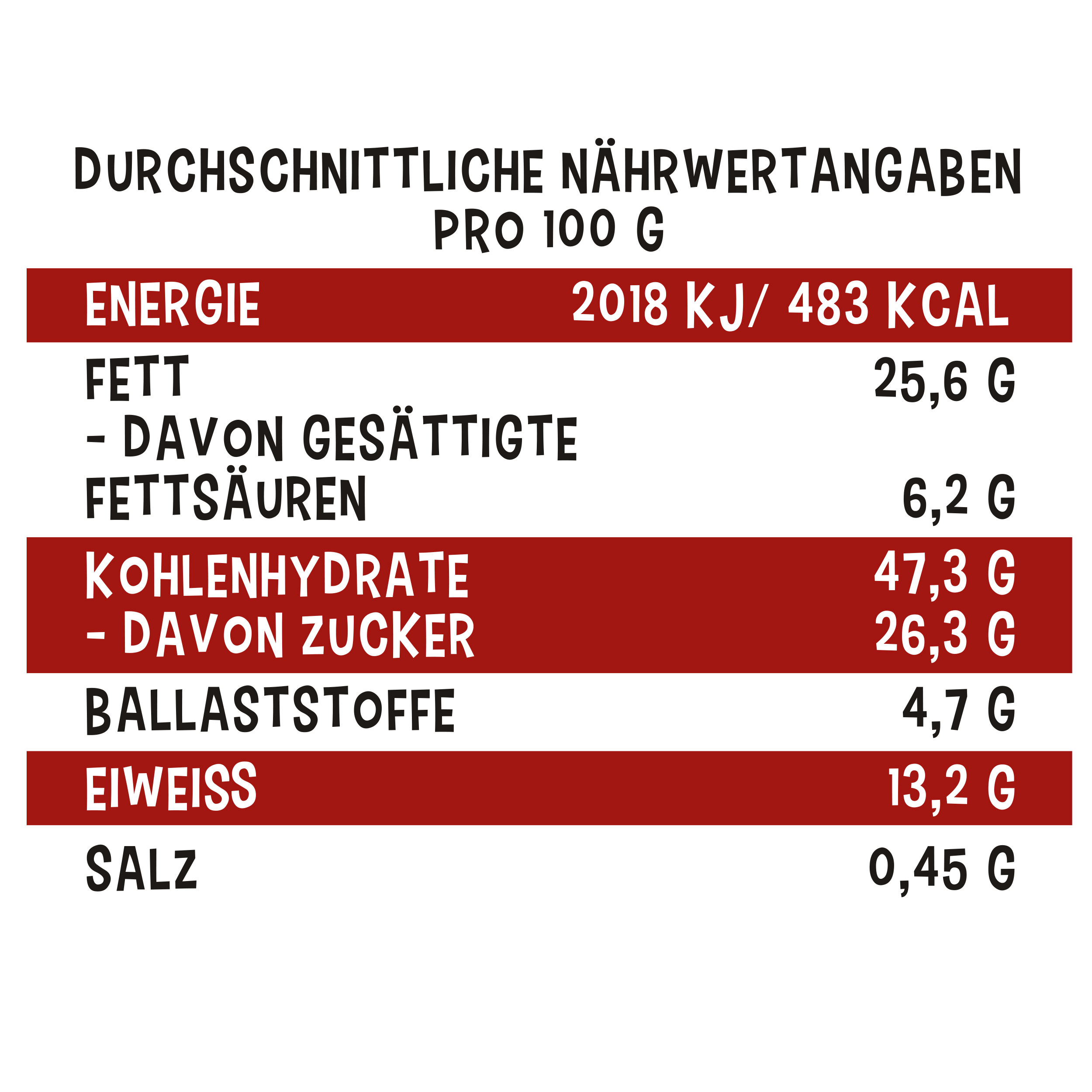 • Rosinen – süß und saftig runden diese kleinen Fruchtperlen die Mischung perfekt ab und bringen eine angenehme Süße ins Spiel.