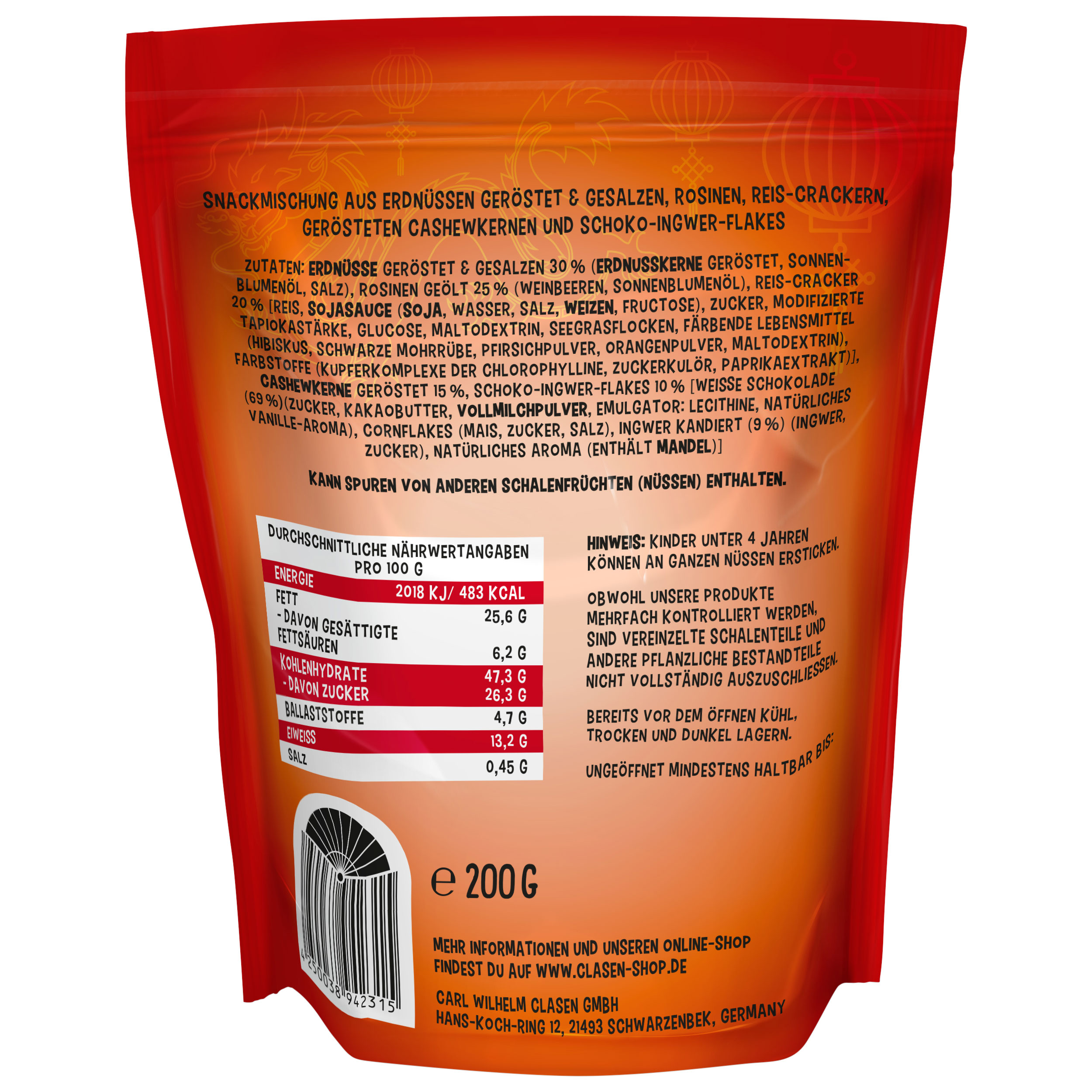 Der China Town Street Food Snack ist ideal für ein hektisches Leben. Ob du mitten in einer intensiven Gaming-Session steckst, auf deinem Skateboard neue Tricks ausprobierst oder einfach eine kleine Pause machst – diese Mischung bietet dir sofort verfügbare Energie. Natürlich ist die Mischung ohne Geschmacksverstärker. Gut für dich: sie ist eine Quelle für Ballaststoffe. Die Kombination aus Nüssen und Rosinen sorgt für eine schnelle und langanhaltende Energiefreisetzung, die dich wach und konzentriert hält.