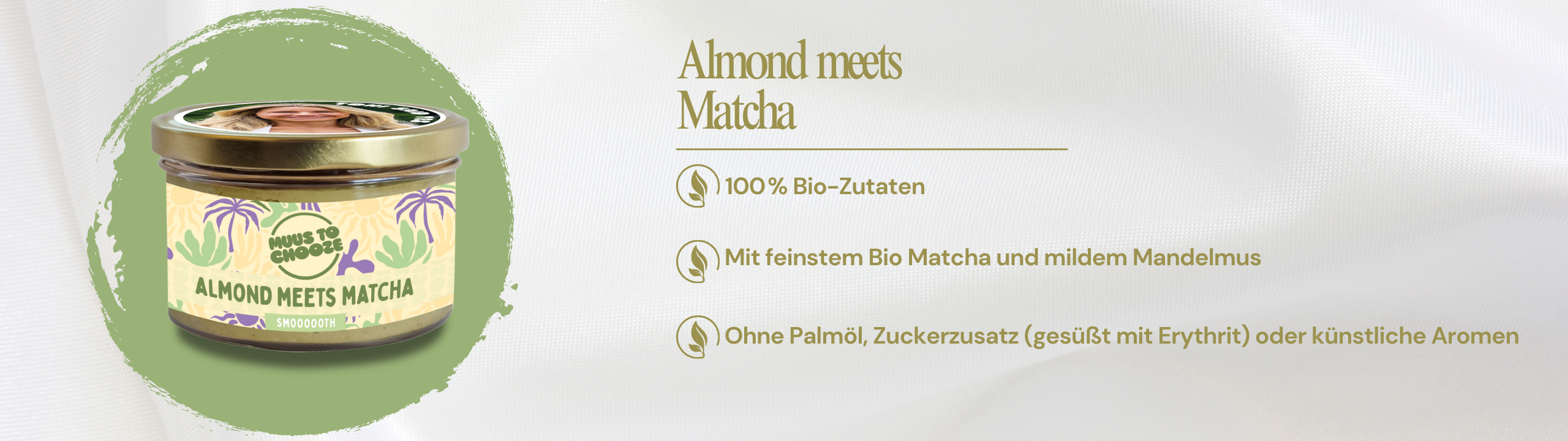 Gemeinsam haben wir ein Nussmus kreiert, das nicht nur perfekt in ein gesundes Ernährungskonzept passt, sondern auch geschmacklich völlig neue Maßstäbe setzt: Bio-Mandelmus aus blanchierten Mandeln, feinem Matchapulver, echter Bourbon Vanille und statt Zucker verwenden wir ausschließlich Erythrit.